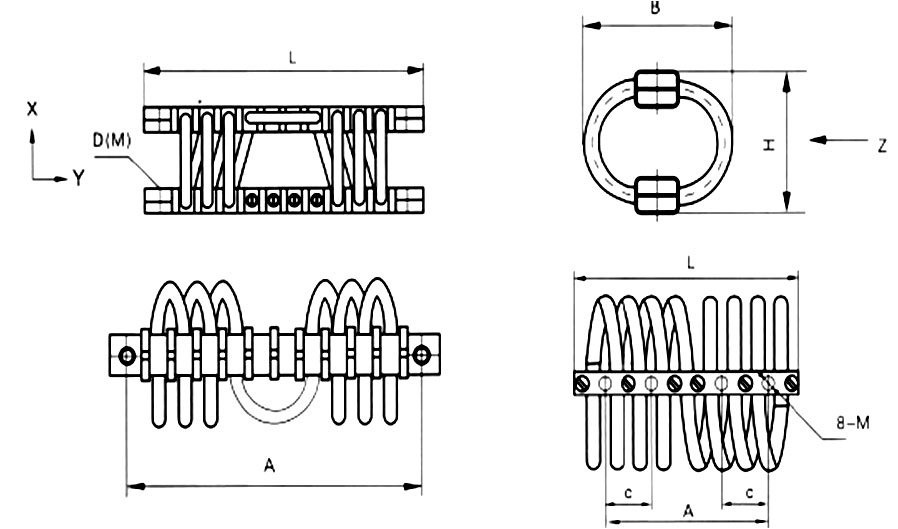 Damping ratio (c/Cc) | L | A | H | B | C | D | |