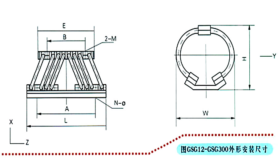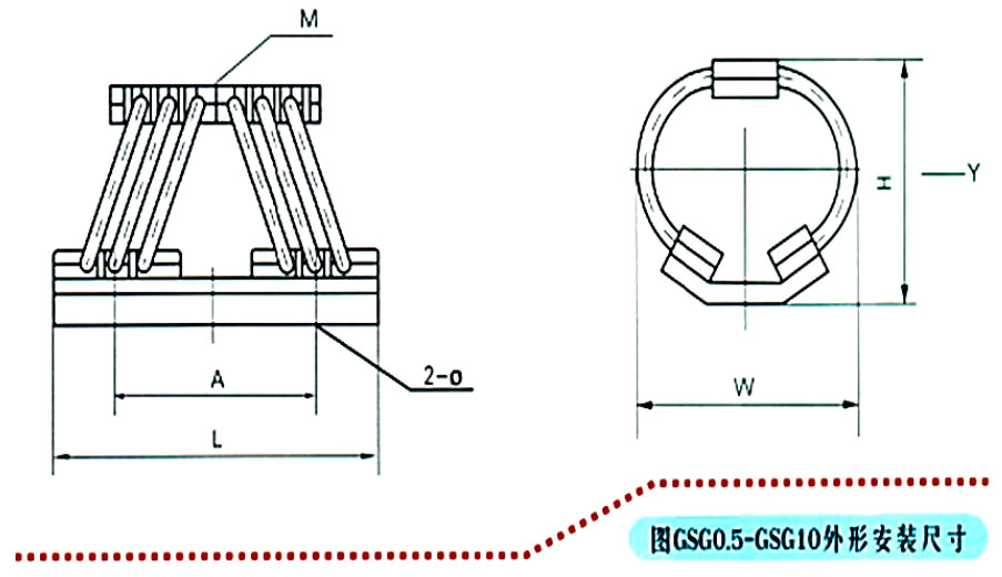 Outline installation size of GSG series stainless steel wire rope vibration isolator;