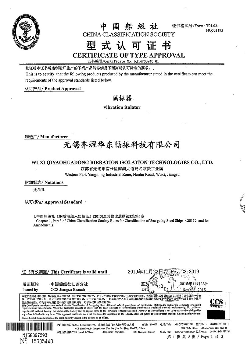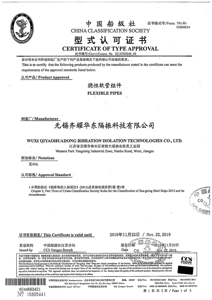 应我公司申请,中国船级社按照相关规范及有关程序的要求,于2013年6月至2015年,对我公司涉及所申请产品的设计、采购、生产、检验等有关的质量体系进行了审核,同时对隔振器及挠性软管品进行了技术文件及图纸的审查和型式试验。 审核及实验采取抽样的形式进行,审核结果表明我公司质量体系满足中国船级社专业质量体系要求,具备生产所申请产品的能力和条件及有关条款规定要求,特给予型式认可证书。 中国船级社(CCS)作为交通部直属单位,属于船舶技术检验机构,为中国从事船舶入级检验业务的专业机构,及国际船级社协会10家正式会员之一。此次获得中国船级社行式认可证书对于进一步提高企业知名度及市场竞争力将发挥积极作用。