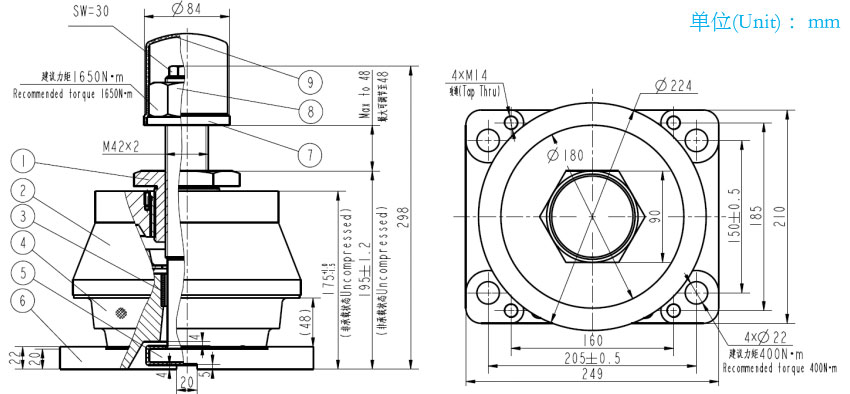 4、锥形减振圈;5、缓冲限位螺栓;6、下座板;7、垫圈;8、细牙螺母;9、防水帽。